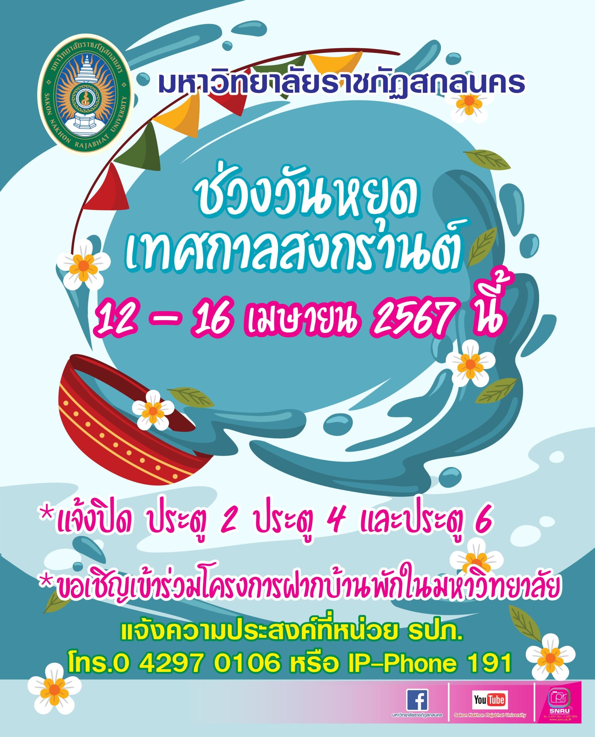 ประกาศช่วงวันหยุดเทศกาลสงกรานต์ เผยเเพร่เมื่อ เมษายน 11, 2567เมษายน 11, 2024 โดย admin 985 เข้าชม ช่วงวันหยุดเทศกาลสงกรานต์ 12-16 เมษายน 2567 แจ้งปิด ประตู 2 ประตู 4 และประตู 6 ขอเชิญเข้าร่วมโครงการฝากบ้านพักในมหาวิทยาลัย แจ้งความประสงค์ที่หน่วย รปภ. โทร.0 4297 0106 หรือ IP-Phone 191 เข้าชม : 719 FacebookFacebookXXLINELine