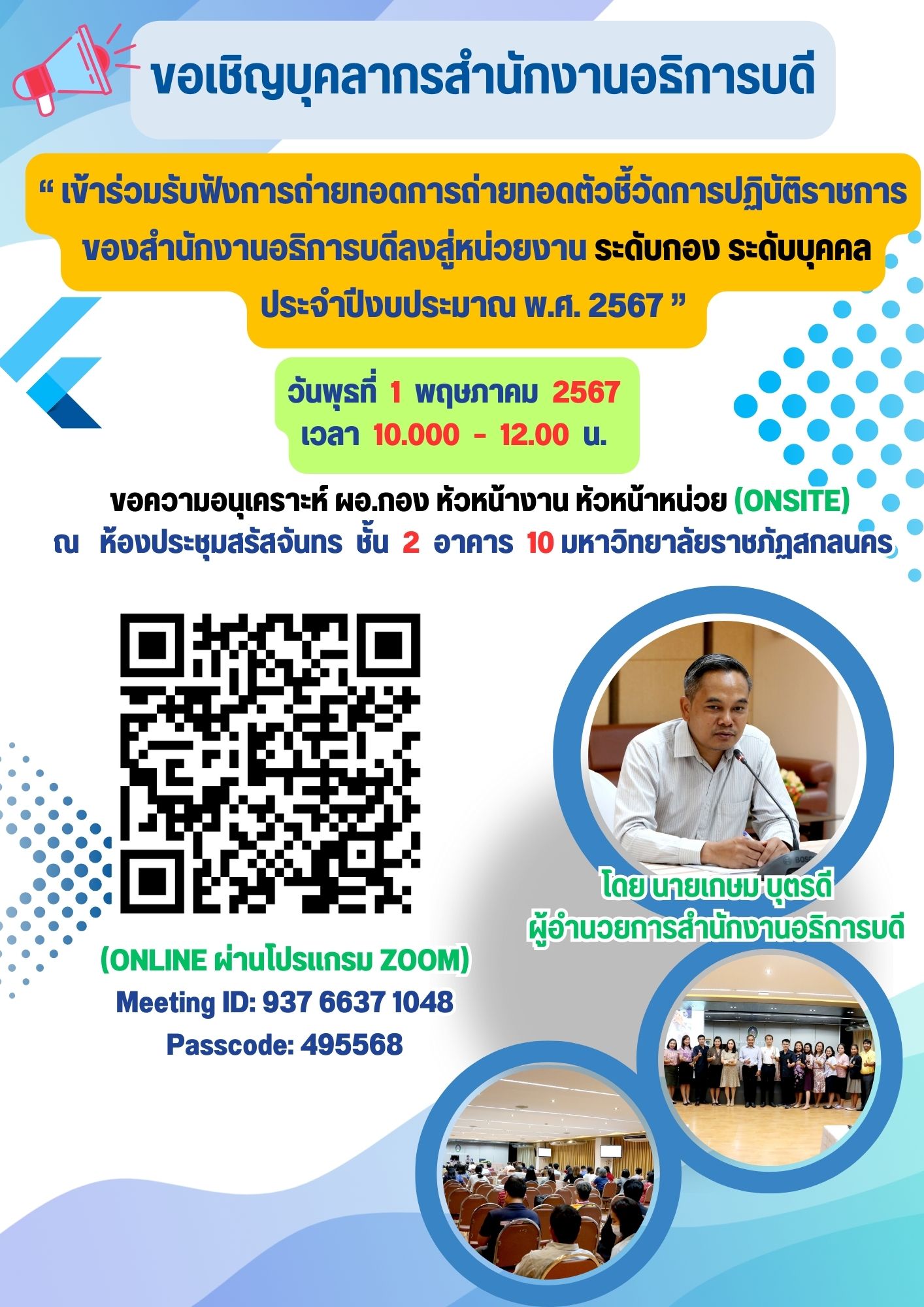 วันพุธที่ 1 พฤษภาคม 2567 เวลา 10.00 – 12.00 น. สำหรับคณะกรรมการ ผอ.กอง หน.งาน หน.หน่วย