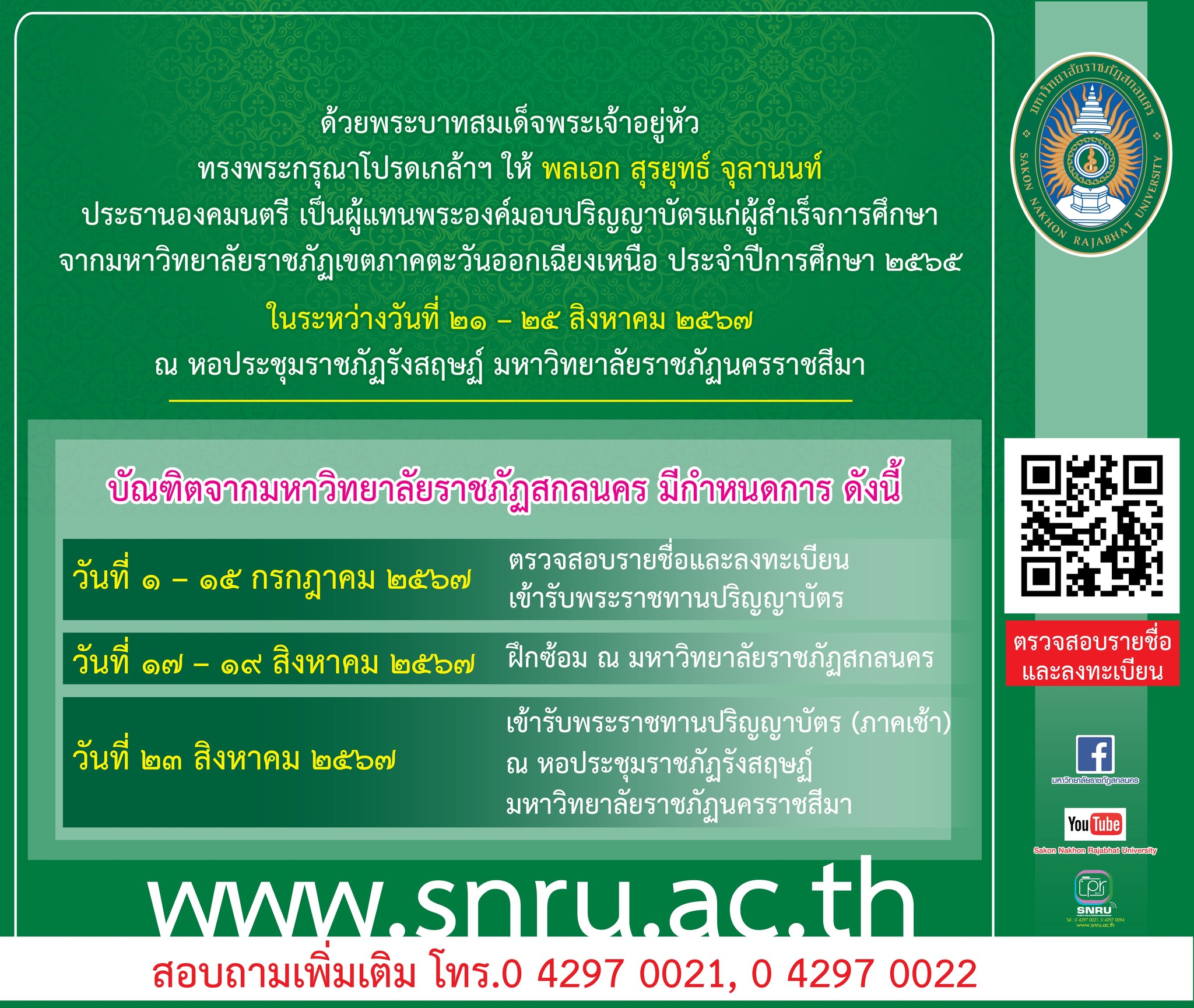 วันที่ 1 – 15 กรกฎาคม 2567 ตรวจสอบรายชื่อและลงทะเบียนเข้ารับพระราชทานปริญญาบัตรที่ลิงก์ reg.snru.ac.th