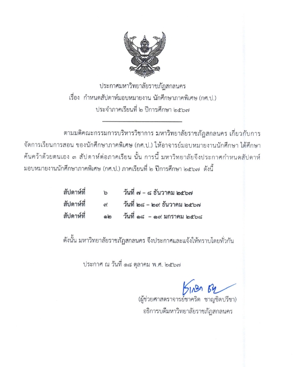 ประกาศมหาวิทยาลัยราชภัฏสกลนคร เรื่องกำหนดสัปดาห์มอบหมายงาน นักศึกษาภาคพิเศษ (กศ.ป.) ภาคเรียนที่ 2/2567 เผยเเพร่เมื่อ ตุลาคม 21, 2567ตุลาคม 21, 2024 โดย admin 559 เข้าชม เข้าชม : 683 FacebookFacebookXXLINELine