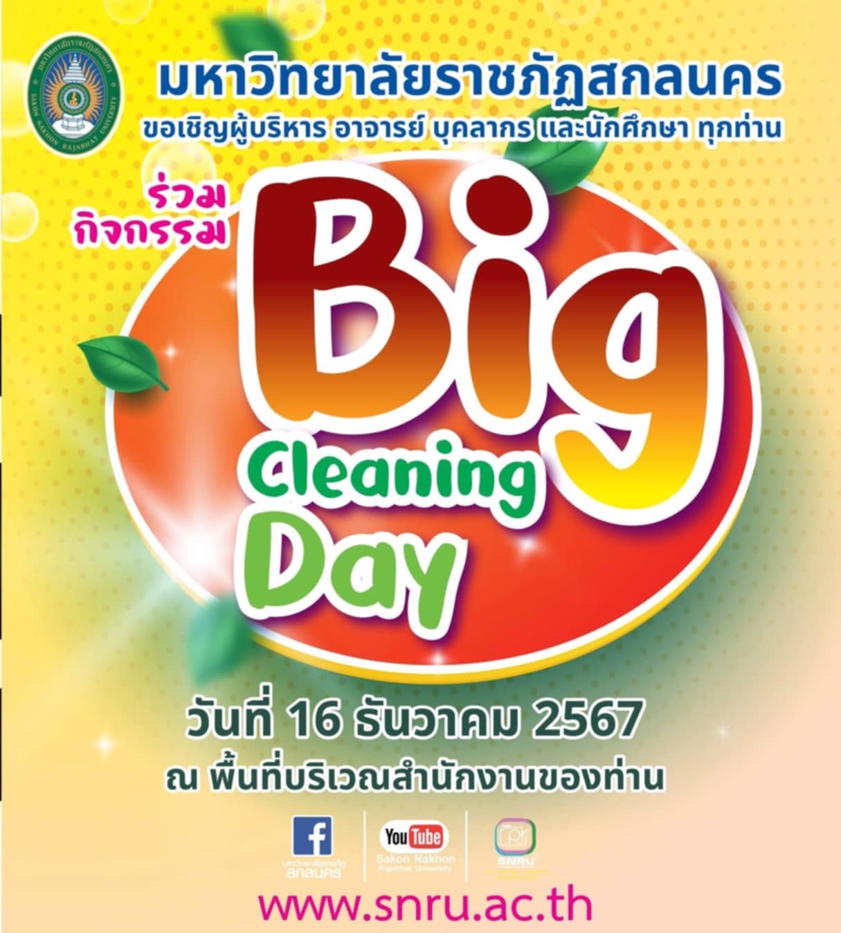 มหาวิทยาลัยราชภัฏสกลนคร ขอเชิญผู้บริหาร อาจารย์ บุคลากร และนักศึกษา ทุกท่าน ร่วมกิจกรรม “Big Cleaning Day” ในวันที่ 16 ธันวาคม 2567 ณ พื้นที่บริเวณสำนักงานของท่าน เผยเเพร่เมื่อ ธันวาคม 15, 2567ธันวาคม 15, 2024 โดย admin 752 เข้าชม เข้าชม : 555 FacebookFacebookXXLINELine