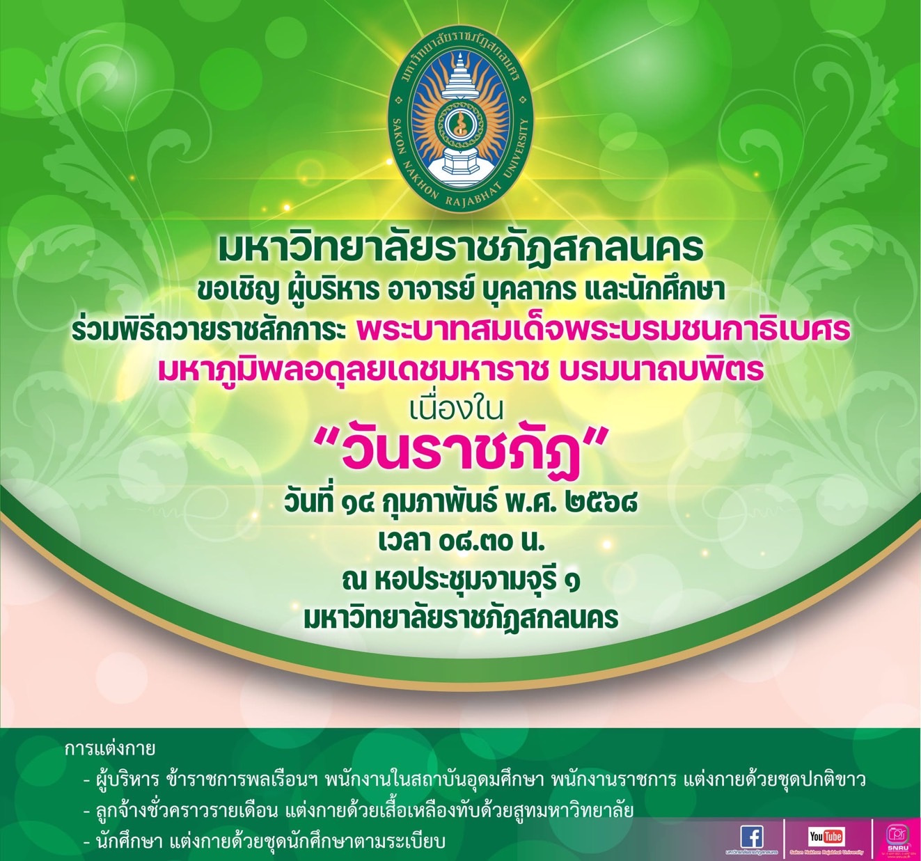 มหาวิทยาลัยราชภัฏสกลนคร ขอเชิญ ผู้บริหาร อาจารย์ บุคลากร และนักศึกษาร่วมพิธีถวายราชสักการะ พระบาทสมเด็จพระบรมชนกาธิเบศร มหาภูมิพลอดุลยเดชมหาราช บรมนาถบพิตร เนื่องใน “วันราชภัฏ” ในวันที่ 14 กุมภาพันธ์ พ.ศ.2568 เวลา 08.30 น. ณ หอประชุมจามจุรี 1 มหาวิทยาลัยราชภัฏสกลนคร