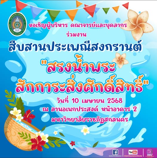 งานสืบสานประเพณีสงกรานต์ มหาวิทยาลัยราชภัฏสกลนคร ประจำปี พ.ศ.2568 เผยเเพร่เมื่อ เมษายน 9, 2568เมษายน 9, 2025 โดย admin 715 เข้าชม ขอเชิญชวนผู้บริหาร คณาจารย์และบุคลากร ชาวมรสน. ร่วมงานสืบสานประเพณีสงกรานต์ “สรงน้ำพระ สักการะสิ่งศักดิ์สิทธิ์ ในวันที่ 10 เมษายน 2568 ณ ลานอเนกประสงค์ หน้าอาคาร 2 มหาวิทยาลัยราชภัฏสกลนคร ตั้งแต่เวลา 09.00 น . – 16.00 น. เข้าชม : 606 FacebookFacebookXXLINELine