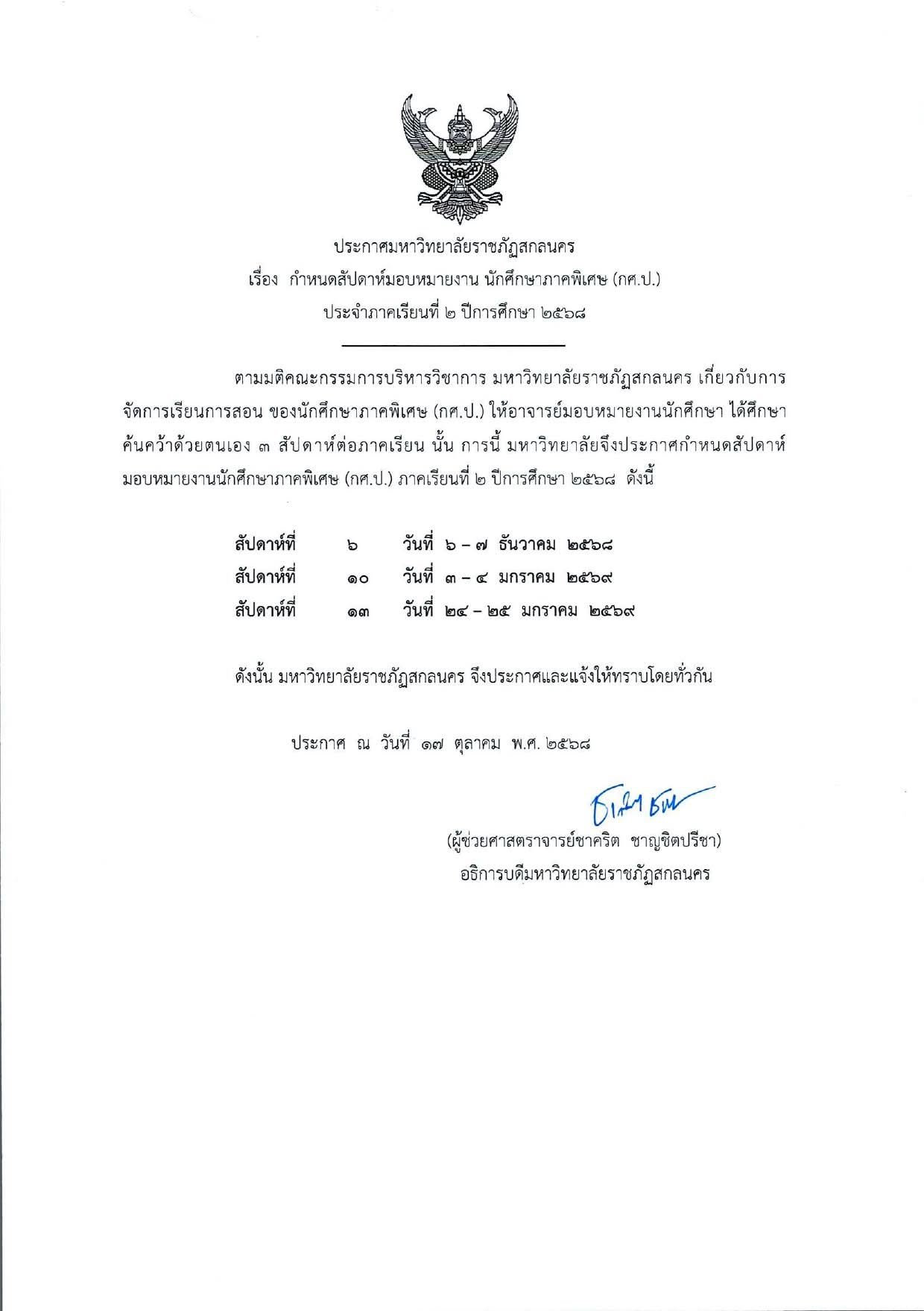 ประกาศมหาวิทยาลัยราชภัฏสกลนคร (สัปดาห์มอบหมายงาน) เผยเเพร่เมื่อ ตุลาคม 20, 2568ตุลาคม 20, 2025 โดย admin 276 เข้าชม ประกาศมหาวิทยาลัยราชภัฏสกลนคร เรื่อง กำหนดสัปดาห์มอบหมายงาน นักศึกษาภาคพิเศษ(กศ.ป.) ประจำภาคเรียนที่ 2 ปีการศึกษา 2568 เข้าชม : 270 FacebookFacebookXXLINELine
