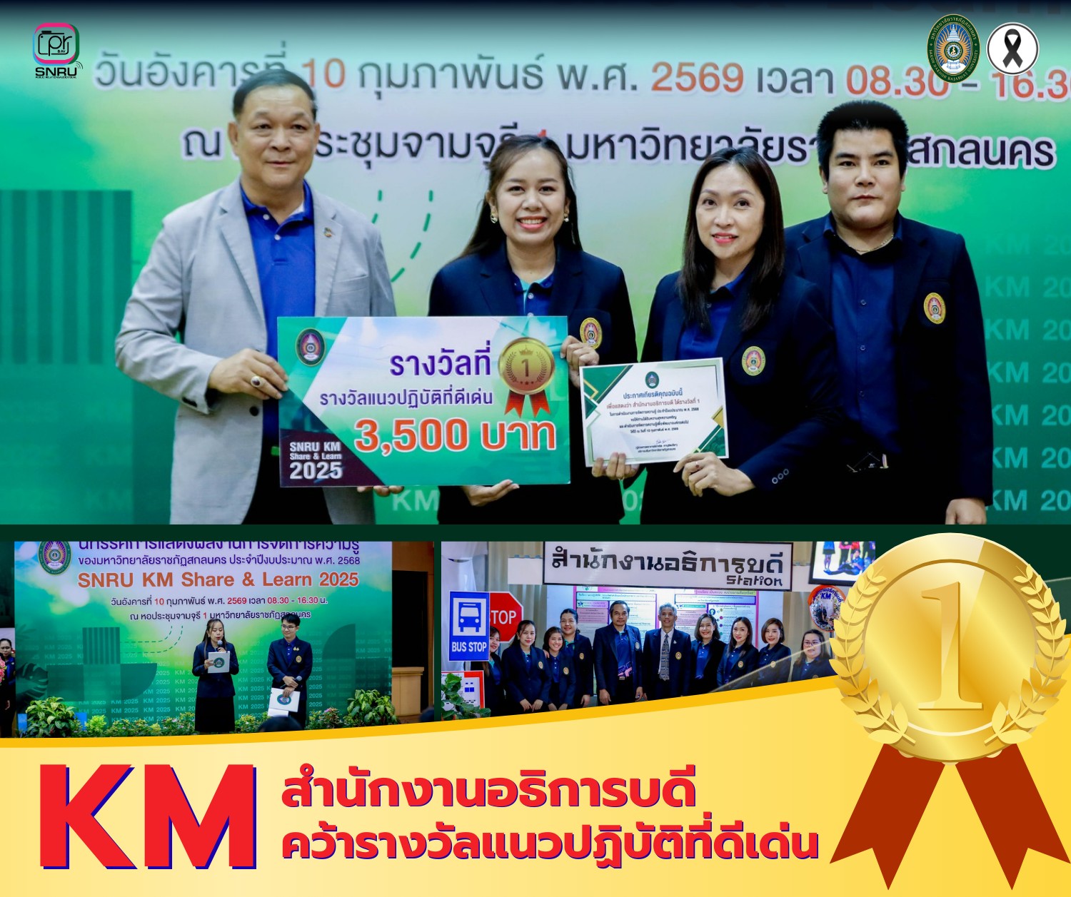 โครงการนิทรรศการแสดงผลงานการจัดการความรู้ของมหาวิทยาลัยราชภัฏสกลนคร ประจำปีงบประมาณ พ.ศ. 2568 (SNRU KM Share & Learn 2025) สำนักงานอธิการบดีด้รับรางวัลที่ 1 ประเภทแนวปฏิบัติที่ดีเด่น โดยได้ส่งผลงานเข้าร่วมจำนวน 2 ผลงาน ได้แก่