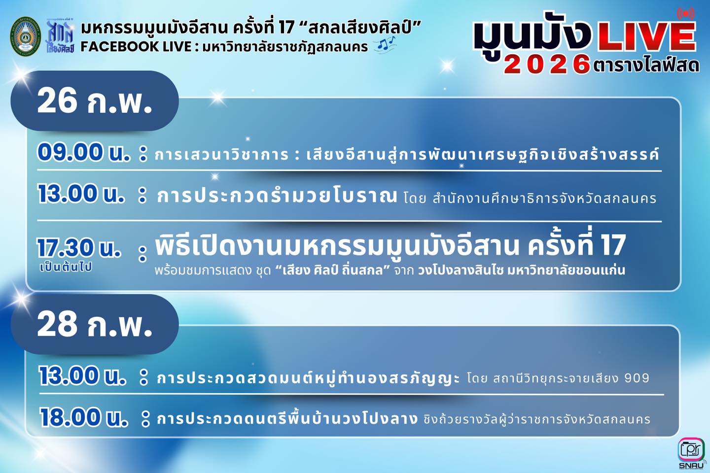 เสียงศิลป์…กำลังจะก้องเมืองสกลอีกครั้ง! เช็กตาราง LIVE ให้พร้อม! มหกรรมมูนมังอีสาน ครั้งที่ 17 “สกลเสียงศิลป์”