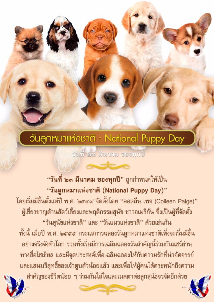 23 มีนาคมของทุกปี เป็น วัน National Puppy Day หรือ “วันลูกสุนัขแห่งชาติ” จุดประสงค์ที่จัดวันนี้ขึ้นนอกจากจะเฉลิมฉลองให้กับความน่ารักของน้องหมาแล้ว ยังถูกจัดขึ้นเพื่อให้ผู้คนหันมาสนใจและตระหนักถึงความสำคัญของน้อง ๆ กันมากขึ้น