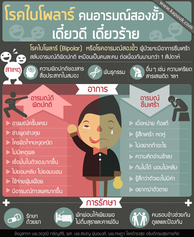 - ช่วง Mania (อารมณ์ดี/คึกคักผิดปกติ): ร่าเริงเกินจริง, พูดมาก/เร็ว, ไม่หลับไม่นอน, มั่นใจสูง